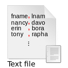 A stylistic depiction of a fragment from a CSV-formatted text file. The commas (shown in red) are used as field delimiters.