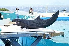 Killer whales are well known for their performances in shows, but the number of orcas kept in captivity is very small, especially when compared to the number of bottlenose dolphins, with only 44 captive killer whales being held in aquaria as of 2012.[65] The killer whale's intelligence, trainability, striking appearance, playfulness in captivity and sheer size have made it a popular exhibit at aquaria and aquatic theme parks. From 1976 to 1997, 55 whales were taken from the wild in Iceland, 19 in Japan and three in Argentina. These figures exclude animals that died during capture. Live captures fell dramatically in the 1990s, and by 1999, about 40% of the 48 animals on display in the world were captive-born.[14]