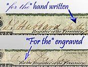 - Engraved as either "For the" or "for the" next to "Register of the Treasury" and "Treasurer of the United States"
