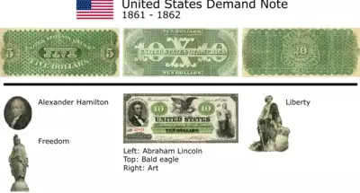 Because of the distinctive green ink on their reverse, and because state-chartered bank and Confederate notes of the day typically had blank reverse, the Demand Notes were nicknamed "greenbacks", a name later inherited by United States Notes and Federal Reserve Notes. The obverse of the Demand Notes contained familiar elements such as the images of a bald eagle, Abraham Lincoln, and Alexander Hamilton, though the portraits used on Demand Notes are different from the ones seen on U.S. currency today.