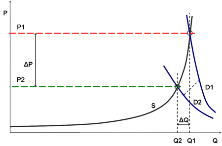 If demand response measures are employed the demand becomes more elastic (D2). A much lower price will result in the market (P2).