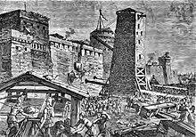 Demetrius sailed from Athens in the spring of 306 BC and in accordance with his father's orders he first went to Karia where he summoned the Rhodians to support his naval campaign. The Rhodians refused, a decision which would have dire consequences. In the campaign of 306 BC, he defeated Ptolemy and Menelaus, Ptolemy's brother, in the naval Battle of Salamis, completely destroying the naval power of Ptolemaic Egypt.[1] Demetrius conquered Cyprus in 306 BC, capturing one of Ptolemy's sons.[3] Following the victory, Antigonus assumed the title "king" and bestowed the same upon his son Demetrius. In 305 BC, he endeavoured to punish the Rhodians for having deserted his cause; his ingenuity in devising new siege engines in his (ultimately unsuccessful) attempt to reduce the capital gained him the title of Poliorcetes.[1] Among his creations were a battering ram 180 feet (55 m) long, requiring 1000 men to operate it; and a wheeled siege tower named "Helepolis" (or "Taker of Cities") which stood 125 feet (38 m) tall and 60 feet (18 m) wide, weighing 360,000 pounds.