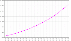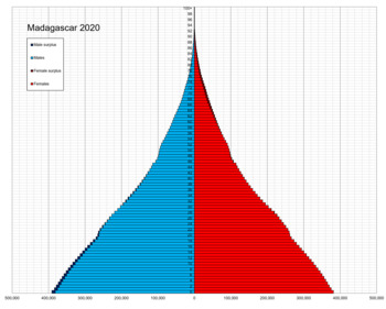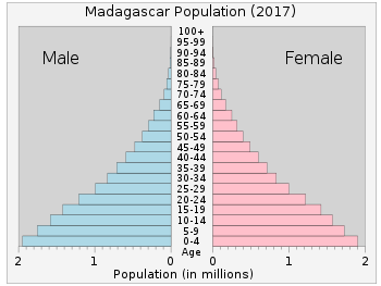 The problem with population estimation in Madagascar is that data is very old and limited. The last population census was carried out in 1993, after an initial 1975 census. There was an attempt at a census in 2009, but this attempt ultimately failed due to political instability. Therefore, the demographic situation is inferred but reliability of any estimates from any source has a large margin of error. According to the 2019 revision of the World Population Prospects[1][2] the total population was 26,262,313 in 2018, compared to only 4,084,000 in 1950. The proportion of children below the age of 15 in 2010 was 43.1%, 53.8% was between 15 and 65 years of age, while 3.1% was 65 years or older .[3]