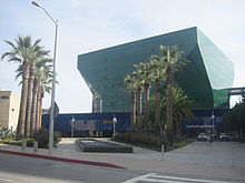 Demolition Man was the first production to film at the Los Angeles Convention Center after it was rebuilt in the 1990s, it was used as the Cocteau Center.[13] "San Angeles" was filmed in Orange County, California. Several locations in Irvine were also used.[13][31][32] The S.A.P.D. police station in the background was the GTE Corporate Headquarters in Westlake Village, California (which later became the Baxter Healthcare building, and was used in the first episode of The Orville). The Pacific Design Center, in West Hollywood was used for the exterior shot of Lenina Huxley's apartment building. The cryo-prison used the exterior of the Metropolitan Detention Center in downtown Los Angeles.[33][34] Filming also took place at Wilshire Courtyard, 5700 and 5750 Wilshire Boulevard.[35] A power station in Eagle Rock, Los Angeles, was used as the underground dwellings of Edgar Friendly and the Scraps.[36]