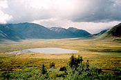 At the time of its construction, the highway was the most northerly major road project to date. Weather and daylight conditions presented challenges. In 1979, a work crew was trapped in a blizzard in the Richardson Mountains and was almost lost.[7] Construction had to account for the permafrost; heat transfer from the highway to the ground had to be prevented so the permafrost would not melt. To address this, the road was built on top of a gravel berm, ranging from 1.2 m (3 ft 11 in) up to 2.4 m (7 ft 10 in), to insulate the permafrost from the road above.[6] Some construction was completed by the Canadian Forces; 3 Field Squadron, RCE from CFB Chilliwack built bridges over the Ogilvie River in 1971[9] and the Eagle River in 1977.[10]