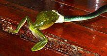 Frogs, water skinks, and small reptiles and their eggs form a large part of the common tree snake's diet, but it will also eat small fish, mammals, geckos, and turtle hatchlings.[6][3]