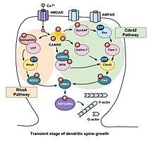 The morphogenesis of dendritic spines is critical to the induction of long-term potentiation (LTP).[5][6] The morphology of the spine depends on the states of actin, either in globular (G-actin) or filamentous (F-actin) forms. The role of Rho family of GTPases and its effects in the stability of actin and spine motility[7] has important implications for memory. If the dendritic spine is the basic unit of information storage, then the spine's ability to extend and retract spontaneously must be constrained. If not, information may be lost. Rho family of GTPases makes significant contributions to the process that stimulates actin polymerization, which in turn increases the size and shape of the spine.[8] Large spines are more stable than smaller ones and may be resistant to modification by additional synaptic activity.[9] Because changes in the shape and size of dendritic spines are correlated with the strength of excitatory synaptic connections and heavily depend on remodeling of its underlying actin cytoskeleton,[10] the specific mechanisms of actin regulation, and therefore the Rho family of GTPases, are integral to the formation, maturation, and plasticity of dendritic spines and to learning and memory.