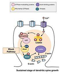 One of the major Rho GTPases involved in spine morphogenesis is RhoA, a protein that also modulates the regulation and timing of cell division. In the context of activity in neurons, RhoA is activated in the following manner: once calcium has entered a cell through NMDA receptors, it binds to calmodulin and activates CaMKII, which leads to the activation of RhoA.[8] The activation of the RhoA protein will activate ROCK, a RhoA kinase, which leads to the stimulation of LIM kinase, which in turn inhibits the protein cofilin. Cofilin's function is to reorganize the actin cytoskeleton of a cell; namely, it depolymerizes actin segments and thus inhibits the growth of growth cones and the repair of axons.[11]