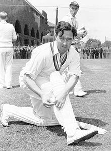 A right-handed batsman and left-arm unorthodox spin bowler, Compton is regularly credited as one of England's most remarkable batsmen.[2] Indeed, Sir Don Bradman said he was one of the greatest cricket players he'd ever seen.[3] He is one of only twenty-five players to have scored over one hundred centuries in first-class cricket.[4] In 2009, Compton was posthumously inducted into the ICC Cricket Hall of Fame.[5] The Denis Compton Oval and a stand at Lord's Cricket Ground are both named in his honour.[6][7]