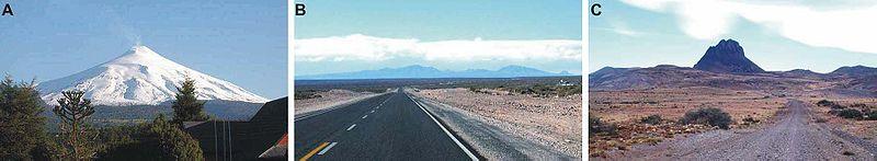 C) Cardiel Lake, Santa Cruz Province, Argentina, a volcanic area under strong effect of denudation, exposing subvolcanic rock body.[5]