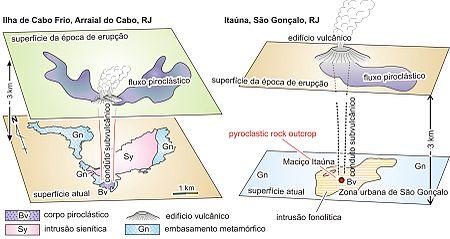 Schematic illustration of regional denudation for felsic alkaline intrusive rock bodies of the State of Rio de Janeiro, Brazil: Cabo Frio Island and Itaúna Body.