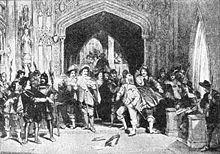 In 1628, he was elected for Dorchester, where his father-in-law had significant influence.[5] He played a prominent role in organising support for the Petition of Right and on 2 March 1629 was one of those who famously forced the Speaker to continue sitting, thus preventing Charles dissolving Parliament.[8] A week later Charles dissolved Parliament, ushering in eleven years of Personal Rule, in which he attempted to regain all the ground lost.[9] Holles, Sir John Eliot and seven others were prosecuted by the Star Chamber and fined; released on bail in October, Holles spent most of the next decade in obscurity.[5]
