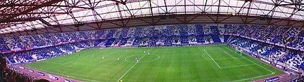 Deportivo have played their home games at the 32,660-capacity Riazor since 1944,[8] when the stadium was built. Their traditional home kit consists of blue and white striped shirts with blue shorts and socks. The club has a long-standing rivalry with national opponents Celta Vigo, and matches between the two sides are known as the Galician derby.