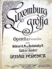 Der Graf von Luxemburg (The Count of Luxembourg) is an operetta in three acts by Franz Lehár to a German libretto by Alfred Willner, Robert Bodanzky, and Leo Stein. A Viennese take on bohemian life in Paris at the beginning of the 20th century, the story revolves around an impoverished aristocrat and a glamorous opera singer who have entered into a sham marriage without ever seeing each other and later fall in love at first sight, unaware that they are already husband and wife.