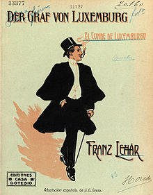 Following its Vienna premiere, Der Graf von Luxemburg was soon performed internationally. It premiered in Germany at Berlin's Neues Operettenhaus on 23 December 1909 and in Hungary a month later as Luxemburg grófja with the libretto translated into Hungarian and adapted by Andor Gábor.[9] When performed outside German-speaking countries the operetta was almost invariably performed in translation, often with the libretto significantly adapted to local theatrical tastes. It was first performed in Italy as Il conte di Lussemburgo at the Teatro Vittorio Emanuele in Turin in 1910, and in France as Le comte de Luxembourg (in a translation by Robert de Flers and Gaston de Caillavet) at the Théâtre Apollo in 1912.[10] The Spanish version premiered at the Teatro Eslava in Madrid as El conde le Luxemburgo in 1910. However, this version was significantly altered from the original. The libretto was adapted and translated by José Juan Cadenas, and the Spanish composer Vicente Lleó Balbastre not only rearranged Lehár's music but also added some music of his own. A year later, Lleó collaborated with the composer Enrique Bru and two new librettists to create a one-act zarzuela, El conde del embudo, even more loosely based on Lehár's original. Der Graf von Luxemburg arrived in Latin America soon after its premiere thanks to travelling operetta companies from Europe. It received its Uruguayan premiere in 1910 at the Teatro Solis in Montevideo performed in the original German and was subsequently performed there for many years, although after the premiere always in either Italian or Spanish translation.[11] A Portuguese company from Porto performed the work in Portuguese translation as O conde de Luxemburgo at the Teatro Amazonas in Brazil in 1913.[12]