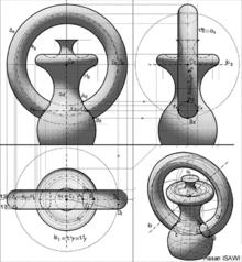 Descriptive geometry is the branch of geometry which allows the representation of three-dimensional objects in two dimensions by using a specific set of procedures. The resulting techniques are important for engineering, architecture, design and in art.[1] The theoretical basis for descriptive geometry is provided by planar geometric projections. The earliest known publication on the technique was "Underweysung der Messung mit dem Zirckel und Richtscheyt", published in Linien, Nuremberg: 1525, by Albrecht Dürer. Italian architect Guarino Guarini was also a pioneer of projective and descriptive geometry, as is clear from his Placita Philosophica (1665), Euclides Adauctus (1671) and Architettura Civile (1686—not published until 1737), anticipating the work of Gaspard Monge (1746–1818), who is usually credited with the invention of descriptive geometry.[2][3] Gaspard Monge is usually considered the "father of descriptive geometry" due to his developments in geometric problem solving. His first discoveries were in 1765 while he was working as a draftsman for military fortifications, although his findings were published later on.[4]