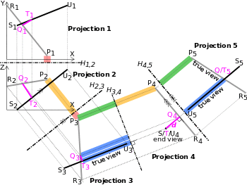 To get a true view (length in the projection is equal to length in 3D space) of one of the lines: SU in this example, projection 3 is drawn with hinge line H2,3 parallel to S2U2. To get an end view of SU, projection 4 is drawn with hinge line H3,4 perpendicular to S3U3. The perpendicular distance d gives the shortest distance between PR and SU.