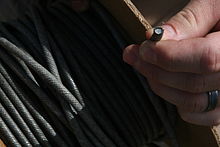 Low-yield detonating cord can be used as a precision cutting charge to remove cables, pipes, wiring, fiber optics, and other utility bundles by placing one or more complete wraps around the target. Detonation cord is used in commercial boilers to break up clinkers (solidified coal ash slag) adhering to tube structures. Also a vertical centered cord being lowered into the water of a drilled well can remove any clogging that obstructs water flow. Higher-yield detonating cord can be used to cut down small trees, although the process is very uneconomical compared to using bulk explosive, or even a chainsaw. High-yield detonating cord placed by divers has been used to remove old dock pilings and other underwater obstructions. Creating a slipknot from detonating cord yields a field-improvised device that can be quickly employed to cut a locked doorknob off a door. Detonation cord can be taped in several rings to the outline of a military man-sized target and detonated, breaching a man-sized hole into wooden doors or light interior walls. Detonating cord is also employed directly in building demolition where thin concrete slabs need be broken via channels drilled parallel to the surface, an advantage over dynamite since a lower minimum of explosive force may be used and smaller diameter holes are sufficient to contain the explosive.[2] Anything much more substantial than these uses requires the use of additional explosives.