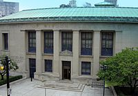 Several additional branches opened shortly afterwards, including one in the Old Main building of Wayne State University. But it was not until 1910 when Andrew Carnegie, the great American library philanthropist of the early 20th century, donated funds did Detroiters decide to build a larger central library to supplement Centre Park. Property near Woodward and Kirby was purchased and in 1912 Cass Gilbert was commissioned to construct his design of a three-floor, early Italian Renaissance-style building. Due to delays and World War I, the Main Library did not open until March 21, 1921. It was dedicated June 3, 1921.[5] In 1937, the Detroit Public Library hired its first African-American librarian, Marjorie A. Blakistone; Blackistone worked throughout her career to expand the library's African-American literature collection.[6] The library system's bookmobile service began in 1940.[7]