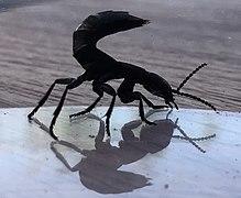 The Latin species name olens, meaning "smelling", refers to the two white stinking glands on the abdomen.[4] This beetle has been associated with the Devil since the Middle Ages,[1] hence its common name, which has been used at least since 1840.[5] Other names include devil's footman, devil's coachman, and devil's steed. It is sometimes also known as the cock-tail beetle[6] for its habit of raising its abdomen. One dictionary proposed the name developed in parallelism with ladybird and its Norse cognates.[7] In Irish, the beetle is called dearga-daol[8] or darbh-daol.[9] British folklore has it that a beetle has eaten the core of Eve's apple, and that a person who crushes such beetle is forgiven seven sins.[10]