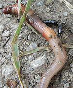 It is a predator, hunting mainly by night, feeding on a range of invertebrates, including worms, slugs, spiders, small moths, and woodlice, as well as carrion.[4] The prey is caught in the mandibles, which are also used to cut and together with the front legs to manipulate the food into a bolus.[4] The bolus is repeatedly chewed and swallowed, emerging covered with a brown secretion from the foregut, until it is reduced to a liquid that is digested. Skin (in the case of earthworms) and hard materials (from arthropods) are left. The larvae are also carnivorous with similar eating habits.[4]