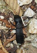 It is a long-bodied, black beetle. At about 20–32 mm (0.8–1.3 in),[11][12] it is one of the larger British beetles. Its wing covers (elytra) are short, covering only its thorax, exposing the abdominal segments. The abdominal musculature is powerful and the abdominal segments are covered with sclerotized plates. It is capable of flight, but its wings are rarely used. It is covered with fine, black hairs. It is well known for its habit of raising its long and uncovered abdomen and opening its jaws,[2] rather like a scorpion when threatened.[4] Although it has no sting, it can give a painful bite with its strong, pincer-like jaws. It also emits a foul-smelling odour, as a defensive secretion, from a pair of white glands at the end of its abdomen.[2]
