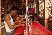 Dhaka, the hand-spun cotton inlay-pattern weaving used to make intricately patterned, colourful panels for Dhaka topis, is the most remarkable and visible cotton textile in Nepal.[16] Pre-dyed cotton is imported from India and weaved by master craftspeople into intricate patterns using only a few colours.[9] The fabric is also used for a type of blouse called Dhaka ko cholo, literally meaning a "blouse made of dhaka fabric", and shawls for women.[16][17] Some farmers and weavers have made preliminary trials of a silk Dhaka topi cloth with limited success.[18]