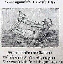 A similar pose named Nyubjasana, "the face-down asana", is described and illustrated in the 19th century Sritattvanidhi.[6] The pose is illustrated in half-tone in the 1905 Yogasopana Purvacatuska and named Dhanurāsana, quoting the Gheranda Samhita's description.[7]