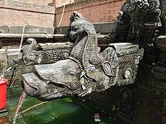 Most of the spouts have the shape of the mythical makara (also called hitimanga). This is a creature with the snout of a crocodile, the trunk of an elephant, tusks and ears of a wild boar and the tail of a peacock.[13] Hitimangas are ubiquitous in Nepal, not only on hitis, but also on vajras (ritual weapons), toranas (traditional door and window ornaments) and other architectural elements.[13][14][15]