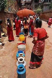 The water shortage is further compounded by an industry that has developed to alleviate it. Deep wells are dug outside the municipal areas by private enterprises. In 2019 about 150 private water companies were active in Kathmandu Valley.[59] This has further lowered the groundwater level, affecting the flow of the hitis. It has also affected farmers in the area who now have to compete for water that has traditionally always been theirs. Water tank trucks from government organisations and commercial water enterprises are a familiar sight in the cities these days.[17][8][60][61][62]
