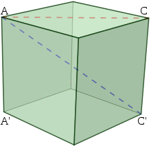 A polyhedron (a solid object in three-dimensional space, bounded by two-dimensional faces) may have two different types of diagonals: face diagonals on the various faces, connecting non-adjacent vertices on the same face; and space diagonals, entirely in the interior of the polyhedron (except for the endpoints on the vertices).