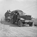 Diamond T tank transporter with a Churchill tank during preparations for crossing the Rhine.
