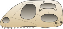 Diapsids ("two arches") are a group of amniote tetrapods that developed two holes (temporal fenestra) in each side of their skulls about 300 million years ago during the late Carboniferous period.[1] The diapsids are extremely diverse, and include all crocodilians, lizards, snakes, tuatara, turtles, and birds.[2] Although some diapsids have lost either one hole (lizards), or both holes (snakes and turtles), or have a heavily restructured skull (modern birds), they are still classified as diapsids based on their ancestry. At least 7,925 species of diapsid reptiles[3] exist in environments around the world today (nearly 18,000 when birds are included).