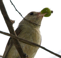 Pale-billed flowerpecker Dicaeum erythrorhynchos with a Muntingia calabura berry (Hyderabad, India)