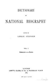 The first volume of the Dictionary of National Biography appeared on 1 January 1885. In May 1891 Leslie Stephen resigned and Sidney Lee, Stephen's assistant editor from the beginning of the project, succeeded him as editor.[1] A dedicated team of sub-editors and researchers worked under Stephen and Lee, combining a variety of talents from veteran journalists to young scholars who cut their academic teeth on dictionary articles at a time when postgraduate historical research in British universities was still in its infancy. While much of the dictionary was written in-house, the DNB also relied on external contributors, who included several respected writers and scholars of the late nineteenth century. By 1900, more than 700 individuals had contributed to the work. Successive volumes appeared quarterly with complete punctuality until midsummer 1900, when the series closed with volume 63.[1] The year of publication, the editor and the range of names in each volume is given below.