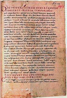 Modern scholars were in disagreement as to whether any Greek original really existed; but all doubt on the point was removed by the discovery of a fragment in Greek amongst the Tebtunis papyri found by Bernard Grenfell and Arthur Hunt in 1899–1900.[4][5] It revealed that the Latin was a close translation. The other surprise was the discovery, in the library of conte Aurelio Guglielmo Balleani at Jesi,[6] of a manuscript of Dictys, in large part of the ninth century, that was described and collated by C. Annibaldi in 1907.