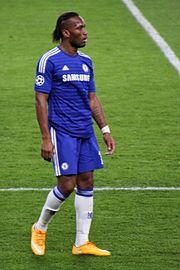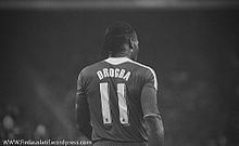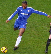 Didier Yves Drogba Tébily (French pronunciation: [didje dʁɔɡba]; born 11 March 1978) is an Ivorian retired professional footballer who played as a striker.[5] He is the all-time top scorer and former captain of the Ivory Coast national team. He is best known for his career at Chelsea, for whom he has scored more goals than any other foreign player and is currently the club's fourth highest goal scorer of all time. Widely regarded as one of Chelsea's greatest players, Drogba was named in the Chelsea team of the 2010–2020 decade by Chelsea's fans.[6] He was named African Footballer of the Year twice, winning the accolade in 2006 and 2009.