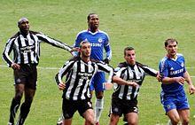 Drogba started the 2005–06 season by scoring two goals in a Community Shield win over Arsenal. His reputation was marred amidst accusations of cheating during Chelsea's 2–0 win over Manchester City. Replays showed that he had used his hand to control the ball before scoring the second of his two goals.[34] This occurred just a week after a similar incident against Fulham where the goal was disallowed.[35] Chelsea went on to retain the league title with two games to play, becoming only the second club to win back-to-back English titles in the Premier League era.[36] Again Drogba finished with 16 goals for the season, 12 in the Premier League, two in the Community Shield, one in the Champions League and one in the FA Cup.[37]