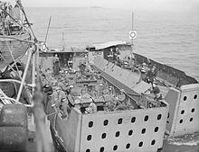 Unaware of the situation on the beaches because of a smoke screen laid by the supporting destroyers, Major General Roberts sent in the two reserve units: the Fusiliers Mont-Royal and the Royal Marines. At 07:00, the Fusiliers under the command of Lieutenant Colonel Dollard Ménard in 26 landing craft sailed towards their beach. They were heavily engaged by the Germans, who hit them with heavy machine gun, mortar and grenade fire, and destroyed them; only a few men managed to reach the town.[10] Those men were then sent in towards the centre of Dieppe and became pinned down under the cliffs and Roberts ordered the Royal Marines to land in order to support them. Not being prepared to support the Fusiliers, the Royal Marines had to transfer from their gunboats and motorboat transports onto landing craft. The Royal Marine landing craft were heavily engaged on their way in with many destroyed or disabled. Those Royal Marines that did reach the shore were either killed or captured. As he became aware of the situation the Royal Marine commanding officer Lieutenant Colonel Phillipps, stood upon the stern of his landing craft and signalled for the rest of his men to turn back. He was killed a few moments later.[16]