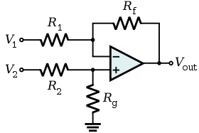 A differential amplifier is a type of electronic amplifier that amplifies the difference between two input voltages but suppresses any voltage common to the two inputs.[1] It is an analog circuit with two inputs and and one output in which the output is ideally proportional to the difference between the two voltages: