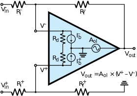 In case the operational amplifier's (non-ideal) input bias current or differential input impedance are a significant effect, one can select a feedback network that improves the effect of common-mode input signal and bias. In Figure 6, current generators model the input bias current at each terminal; I+b and I−b represent the input bias current at terminals V+ and V−, respectively.