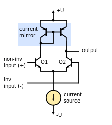 The collector resistors can be replaced by a current mirror, whose output part acts as an active load (Fig. 3). Thus the differential collector current signal is converted to a single ended voltage signal without the intrinsic 50% losses and the gain is greatly increased. This is achieved by copying the input collector current from the left to the right side where the magnitudes of the two input signals add. For this purpose, the input of the current mirror is connected to the left output and the output of the current mirror is connected to the right output of the differential amplifier.