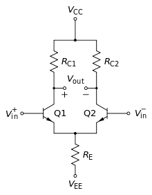 - ^ Long-tail is a figurative name of high resistance that represents the high emitter resistance at common mode with a common long tail with a proportional length (at differential mode this tail shortens up to zero). If additional emitter resistors with small resistances are included between the emitters and the common node (to introduce a small negative feedback at differential mode), they can be figuratively represented by short tails.