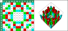 Designed, like most diffusors, to create "a big sound in a small room," unlike other diffusors, two-dimensional diffusors scatter sound in a hemispherical pattern. This is done by the creation of a grid, whose cavities have wells of varying depth, according to the matrix addition of two quadratic sequences equal or proportionate to those of a regular diffusor.[4] These diffusors are very helpful for controlling the direction of the diffusion, particularly in studios and control rooms.[5]