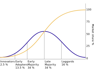 | Innovators | Innovators are willing to take risks, have the highest social status, have financial liquidity, are social and have closest contact to scientific sources and interaction with other innovators. Their risk tolerance allows them to adopt technologies that may ultimately fail. Financial resources help absorb these failures.[42] |