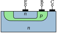 - "Fuller had shown that acceptors of low atomic weight diffuse more rapidly than donors, which made possible n–p–n structures by simultaneous diffusion of donors and acceptors of appropriately different surface concentrations. The first n layer (the emitter) was formed because of the greater surface concentration of the donor (for example, antimony). The base formed beyond it because of the more rapid diffusion of the acceptor (for example, aluminum). The inner (collector) boundary of the base appeared where the diffused aluminum no longer over-compensated the n-type background doping of the original silicon. The base layers of the resulting transistors were 4 μm thick. ... Resulting transistors had a cut-off frequency of 120 MHz."