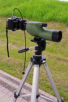 Digiscoping usually refers to using either a digital single-lens reflex camera with lens attached or, more often, a fixed lens point and shoot digital camera to obtain photos through the eyepiece of a birdwatcher's spotting scope.[1] The term has also been associated with the use of a digital camera and spotting scope equipped for prime focus photography.[2]