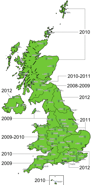 In the UK, the switchover from analogue to digital TV started on 17 October 2007 and was completed on 24 October 2012. Each group of regional transmitters had its analogue broadcasts switched off at a certain point between those dates.