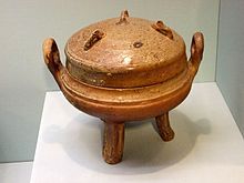 Food vessels such as fu, gui, and dui that were popular in Zhou times disappeared by the Han dynasty, during which the ding, zhong, hu, and fang were the main vessel types used.[36] In Western and Eastern Han, the ding was one of the most common bronze-derived shapes in pottery.[37]