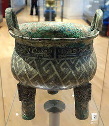 Ding (鼎) are prehistoric and ancient Chinese cauldrons, standing upon legs with a lid and two facing handles. They are one of the most important shapes used in Chinese ritual bronzes. They were made in two shapes: round vessels with three legs and rectangular ones with four, the latter often called fangding. They were used for cooking, storage, and ritual offerings to the gods or to ancestors. The earliest recovered examples are pre-Shang ceramic ding at the Erlitou site[1] but they are better known from the Bronze Age, particularly after the Zhou deemphasized the ritual use of wine practiced by the Shang kings.[2] Under the Zhou, the ding and the privilege to perform the associated rituals became symbols of authority.[3] The number of permitted ding varied according to one's rank in the Chinese nobility: the Nine Ding of the Zhou kings were a symbol of their rule over all China but were lost by the first emperor, Shi Huangdi in the late 3rd century BCE.[4] Subsequently, imperial authority was represented by the Heirloom Seal of the Realm, carved out of the sacred Heshibi; it was lost at some point during the Five Dynasties after the collapse of the Tang.